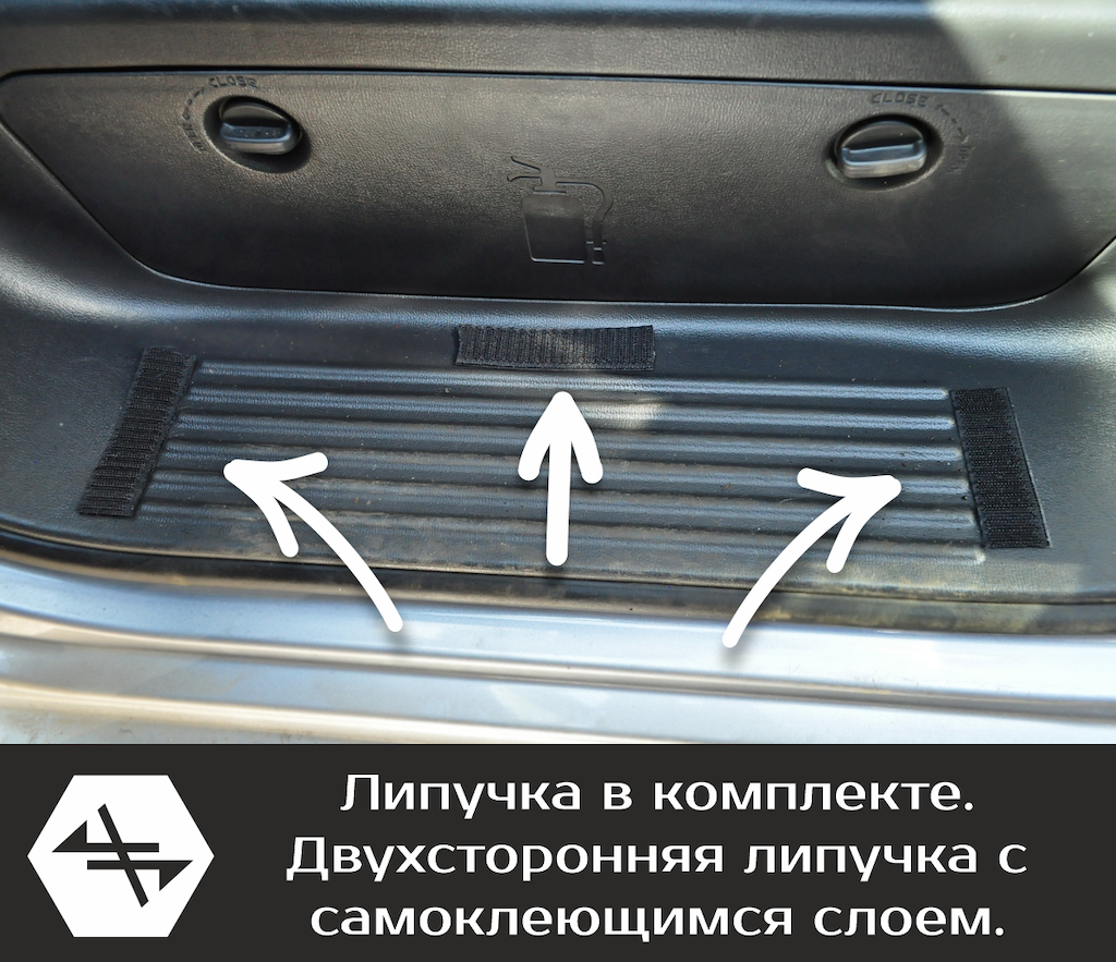 Накладки на пороги надёжно крепятся на липучку. Одна часть липучки вшита под кант на обратной стороне накладки, а вторая ответная часть - на самоклеящейся основе крепится к пластику. Накладки легко снимаются и устанавливаются обратно на своё место, повторяя форму пластика.